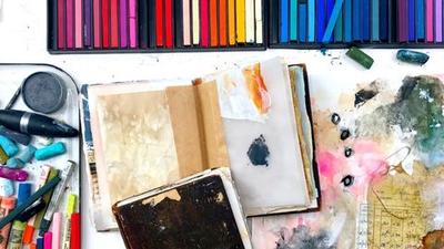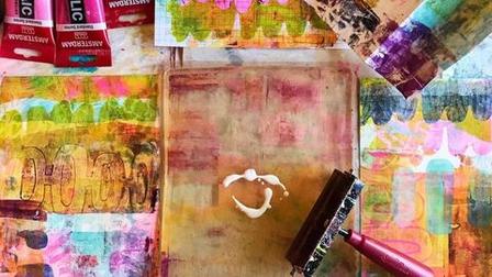 My studio is my happy place, where you’ll find me playing with TONS of different mediums to create my signature layered collages and handmade art journals. (Yes, it gets messy in there.)